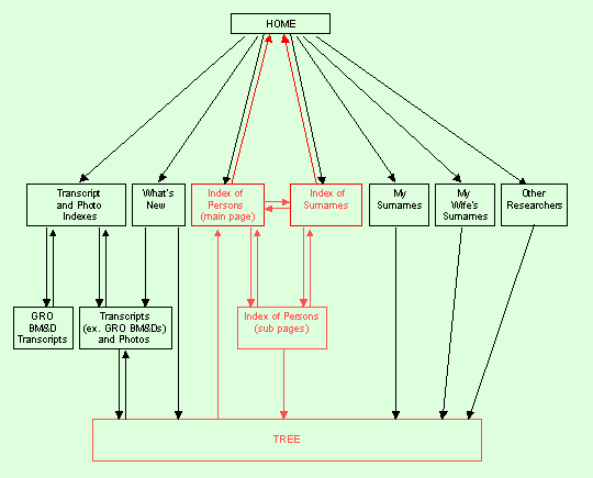Boxes represent Web pages (single or multiple), and arrows represent hyperlinks. Red pages and links are produced using GED2HTML, which converts an exported file from my database (in Gedcom format) to Web pages. Other pages and links are created using FrontPage and/or manual HTML. In addition to the links shown, all pages have a link to the HOME page.